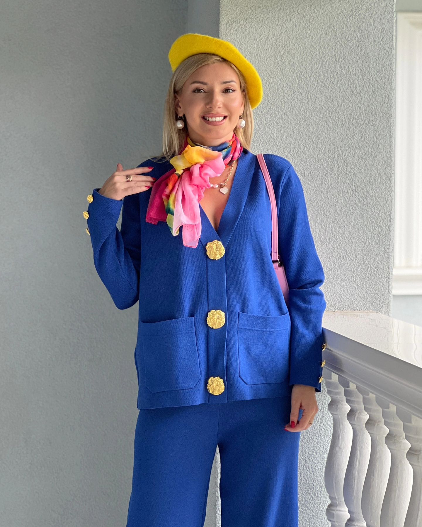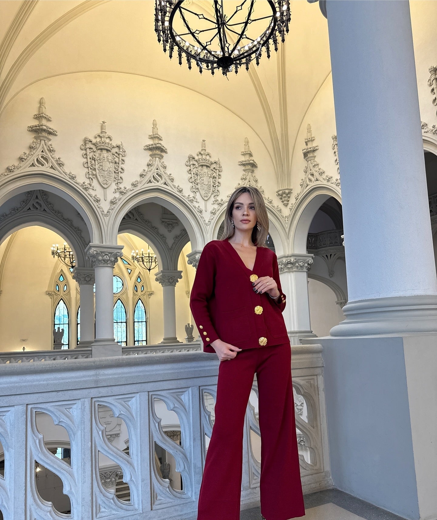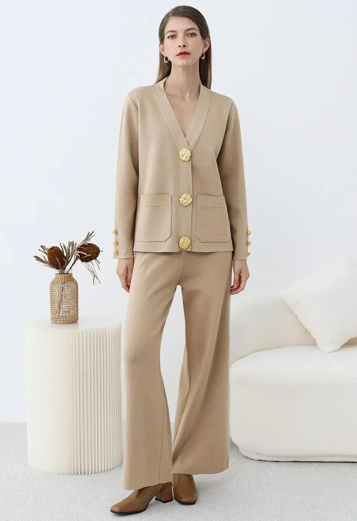 Affichez un luxe discret avec cet ensemble cardigan et pantalon en tricot, conçu pour allier raffinement et bien-être. Son design sophistiqué, agrémenté de boutons dorés et de poches plaquées, apporte une touche chic et intemporelle à votre garde-robe.